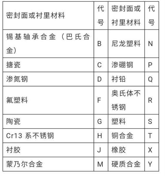 e、密封面或襯里材料代號(hào)。 除隔膜閥外,當(dāng)密封副的密封面材料不同時(shí),以硬度低的材料表示。閥座密封面或襯里材料代號(hào)按如圖 規(guī)定的字母表示。