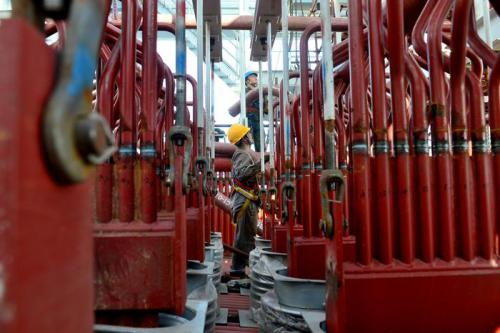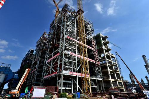 圖為在高58米的3#鍋爐爐頂,作業(yè)工人進行工藝管線的安裝