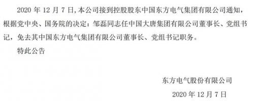 對此消息,《每日經(jīng)濟新聞》記者亦得到證實?!澳壳?,東方電氣集團董事長一職暫時空缺。有關(guān)董事長的變動,今晚或明早上市公司將進行公告?!币晃簧鲜泄緰|方電氣(600875,SH)有關(guān)人士對記者表示。截至記者發(fā)稿,東方電氣已經(jīng)公告了鄒磊職務(wù)變動的事宜。