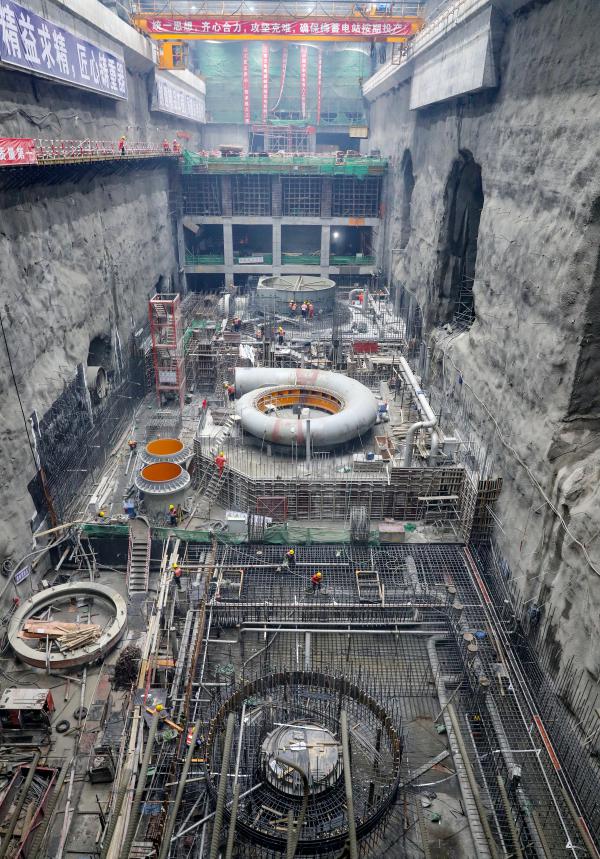 隨著各關(guān)鍵環(huán)節(jié)逐一打通,梅蓄項(xiàng)目建設(shè)也按下了“快進(jìn)鍵”。在電站主廠房,記者看到,一個(gè)大型的環(huán)形“蝸殼”正在焊接組裝;再往前走,一個(gè)巨大的“深坑”映入眼簾,這里便是整個(gè)梅蓄電站的“心臟”。放眼望去,只見4臺(tái)機(jī)組點(diǎn)位旁都圍滿了工人,正熱火朝天進(jìn)行施工作業(yè),最遠(yuǎn)端的機(jī)組,已在進(jìn)行外部建筑物的澆筑,雛形初現(xiàn)。走出廠房外,兩座雄偉的大壩矗立在青蔥山林間,與兩個(gè)巨大的庫區(qū)遙相呼應(yīng),顯得壯觀無比。