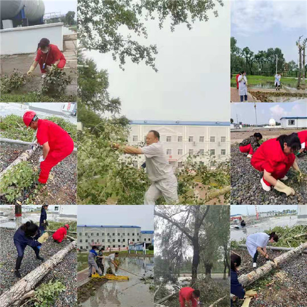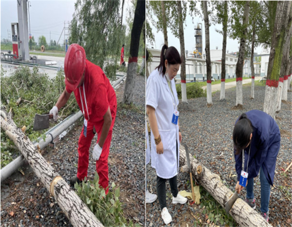 服務(wù)隊(duì)不管男女老少,大家知道消息的,主動(dòng)克服一切困難,積極趕赴現(xiàn)場(chǎng)。5點(diǎn)40分,天然氣分公司培訓(xùn)中心院內(nèi)已經(jīng)開始緊鑼密鼓地清理著地面積水和風(fēng)雨后滿地樹枝,大家熱火朝天的干著。碗口粗的樹倒在水中和地上,經(jīng)過有關(guān)部門允許,這些被風(fēng)吹倒的樹木需要清運(yùn)出去,可是,沒有得心應(yīng)手的專業(yè)電鋸,更沒有能切割樹木的工具,面對(duì)大風(fēng)吹倒碗口粗的大樹,大家陷入思考,這要怎么辦?沒有過多的考慮,一場(chǎng)“人與樹”的大戰(zhàn)就開始了。“魔術(shù)師”王保成“變”出來了斧頭還有砍刀,“只能用這些不是專業(yè)而又“專業(yè)”的切割工具了”,大家用刀和斧頭,輪番砍著碗口粗的大樹。
